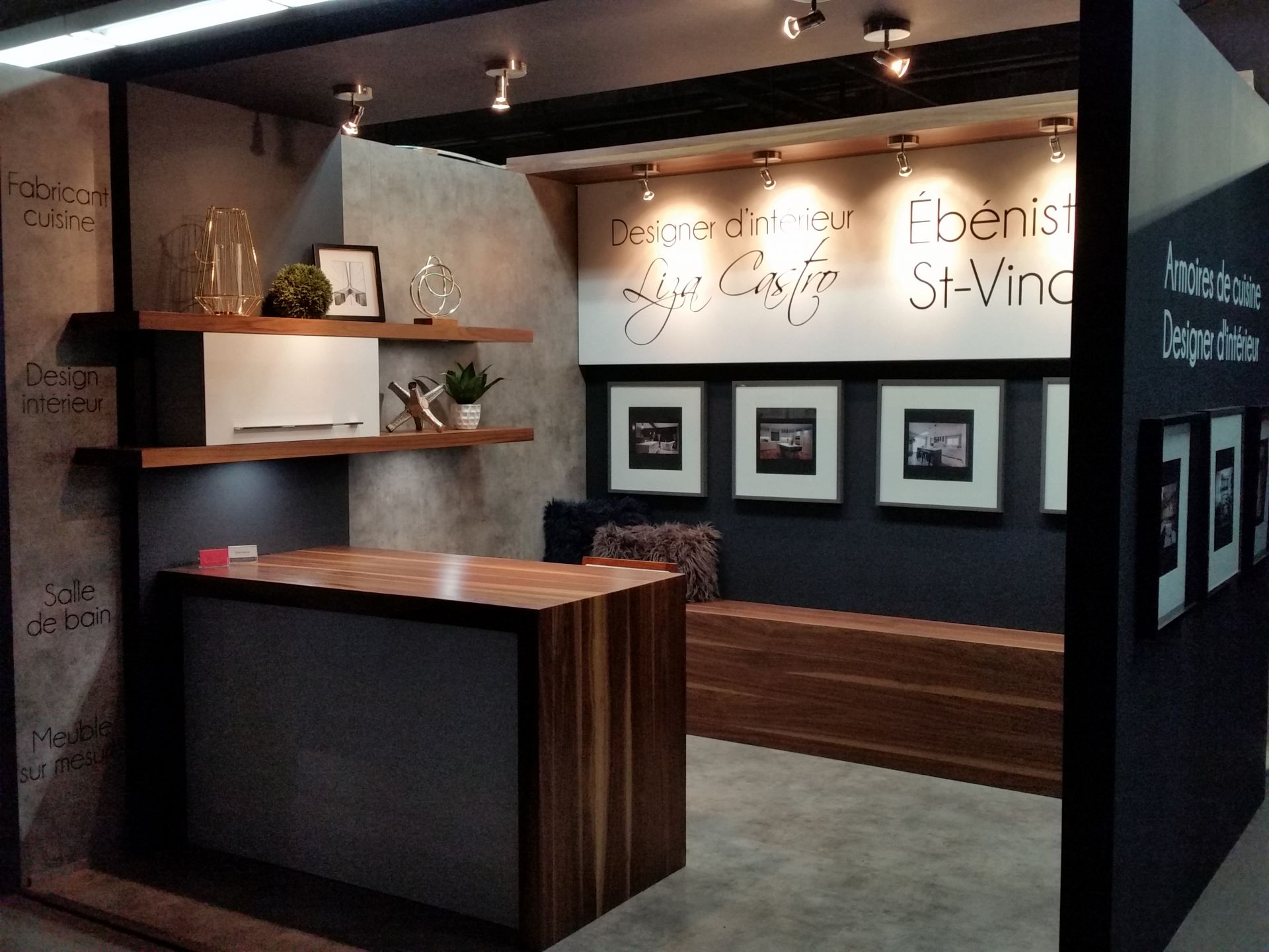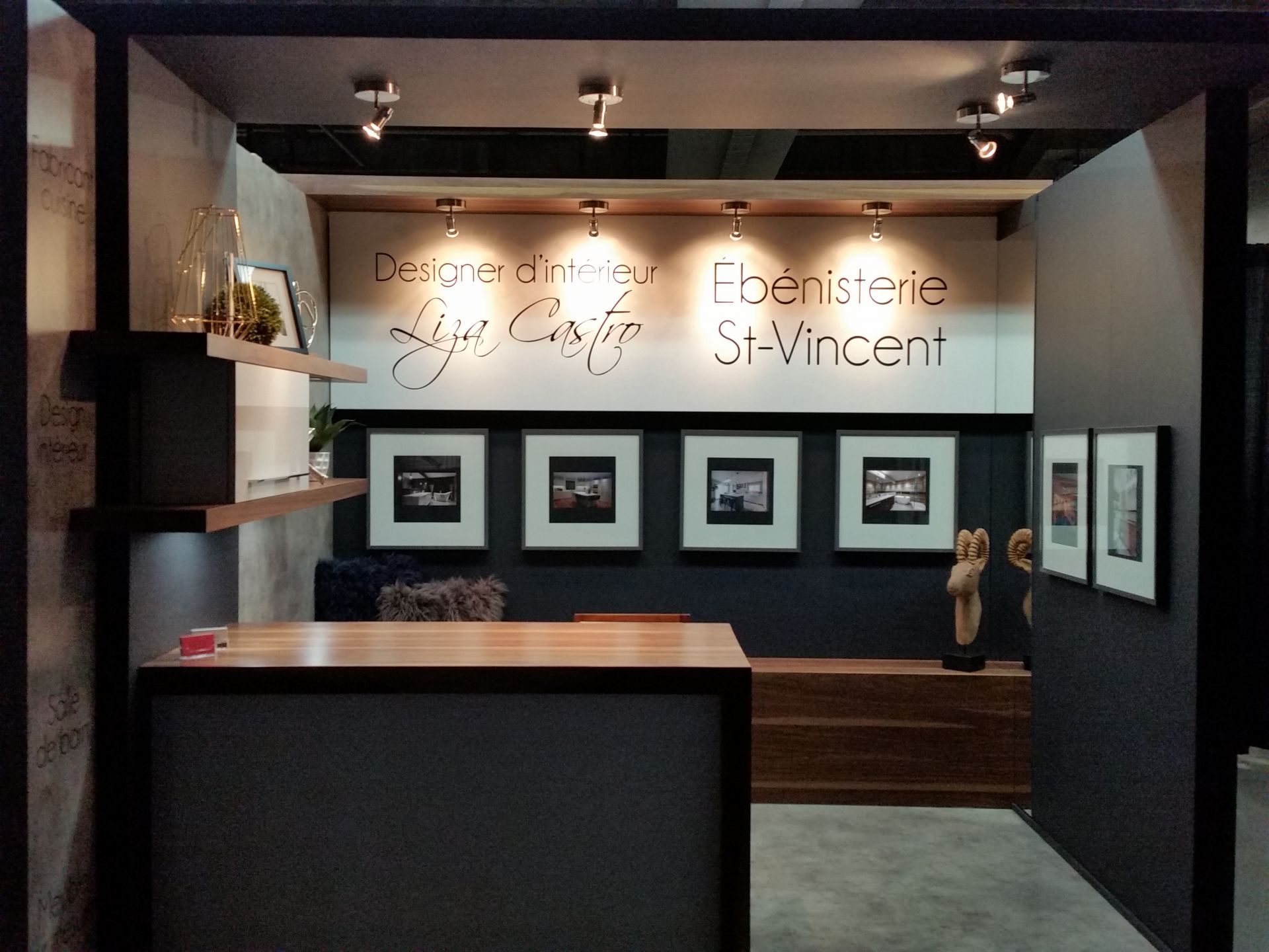 Mon kiosque à l’Expo Habitation du Stade Olympique en février 2017 avec Ébénisterie St-Vincent. J’ai crée une ambiance contemporaine et feutré, démontrant les tendances actuelles. On y retrouve un plancher et un mur couverts de stratifié à l’allure de béton. Pour un contraste bien assumé, les autres murs sont peints d’un gris très foncé. Un miroir sans moulure a été installé au bout du banc, afin de donner un effet de grandeur et de prolongement à celui-ci. La retombée, le banc et les tablettes sont fait d’un placage de noyer tandis que le comptoir avec retombée au sol est en noyer massif assemblé en 45 degrés. Les armoires sont en polymère blanc lustré. Ébénisterie St-Vincent a fabriqué entièrement le kiosque. Les réalisations affichées dans les tableaux ne sont pas leur réalisations, ils proviennent plutôt de mon portfolio.