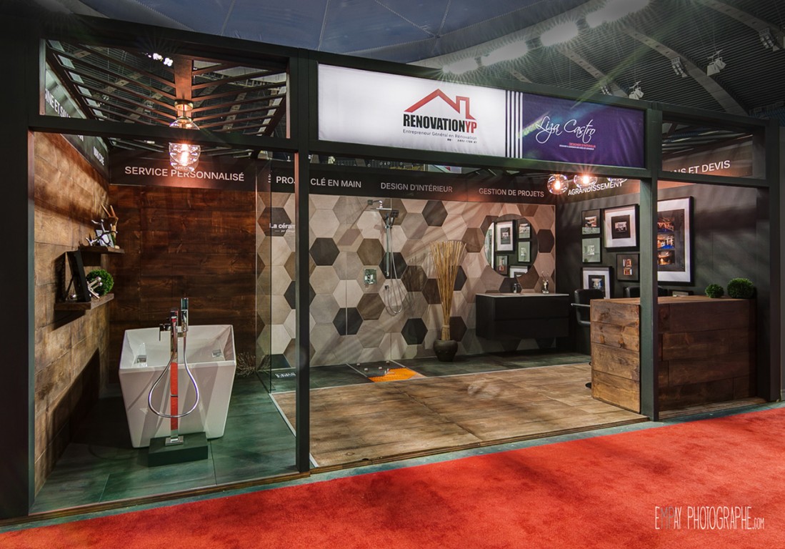 Mon kiosque à l’Expo Habitation du Stade Olympique en octobre 2015 avec Rénovation YP. J’ai reproduit partiellement une salle de bain pour démontrer les tendances actuelles. J’ai crée un mur dynamique avec les tuiles hexagonales Domus de Céragrès et apporter de la texture et un côté rustique en utilisant du pin de Bois Totem derrière le bain. Pour un éclairage vintage, 2 séries de globe vitré de Luminaire Authentik ponctuent les 2 extrémités du kiosque. J’ai dessiné une vanité moderne qui a été fait en laque italienne par mon ébéniste Jaklin Paounov et j’y ai installé un comptoir de verre avec lavabo intégré. Ses surfaces très lustrées contraste merveilleusement bien avec le bois brut et les tuiles mattes. Finalement, un plancher chauffant Shluter est installé en plusieurs étapes pour démontrer qu’il peut même s’installer dans les douches !